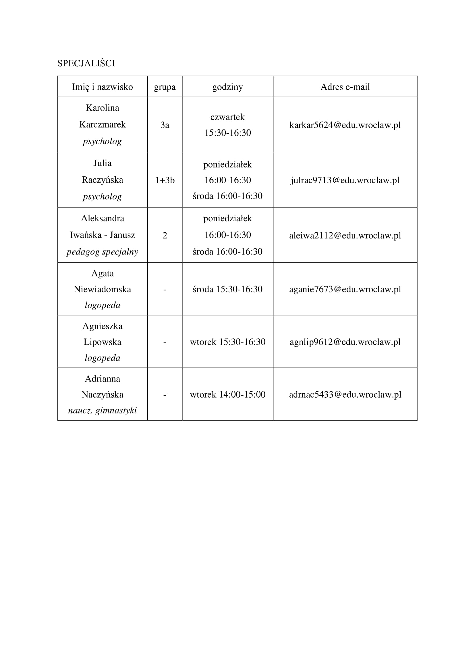Poniżej przedstawiamy harmonogram konsultacji nauczycieli i specjalistów w roku 2022/2023.Bardzo prosimy, aby chęć konsultacji każdorazowo zgłaszali Państwo nauczycielowi lubspecjaliście celem upewnienia się, że termin jest jeszcze wolny i nie został już zajęty przezinnego rodzica.